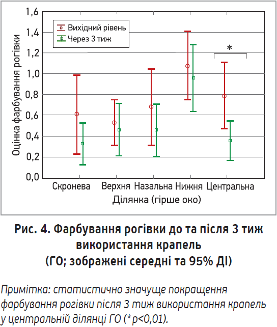 Покращення фарбування рогівки на кінцевому візиті спостерігалося в усіх квадрантах обох очей. Утім, покращення досягло статистичної значущості лише в центральних ділянках обох очей (р<0,00001; рис. 4).