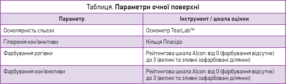 Після другого визначення осмолярності оцінювали інші параметри очної поверхні. Гірше око (ГО) визначали як око з найвищою осмолярністю сльози, краще око (КО) – як око з найнижчою осмолярністю, виміряною до початку лікування.
