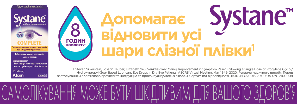 Як засоби для зволоження ПО доцільно застосовувати лінійку Систейн від компанії Alcon. Препарат слід обирати залежно від того, який шар сльози необхідно відновити. За потреби відновити ліпідний компонент доцільно призначати Систейн Баланс, у разі потреби відновлення водномуцинового шару – Систейн Ультра, Систейн Аква чи Систейн гель. Різні концентрації активних речовин у цих засобах дають змогу підбирати оптимальний сльозозамінник для кожного пацієнта. Крім того, існує універсальний препарат Систейн Компліт, що дозволяє відновити як ліпідну, так і водномуцинову складові СП, оскільки містить і гідроксипропілгуар, і ліпідну емульсію. Інноваційні технології, застосовані при виробництві Систейн Компліт, включають формування крапель олії нанорозміру (<100 нм) за допомогою методу Microfluidizer, що забезпечує велику площу покриття ПО, трикратну концентрацію змащувачів для збільшення їхньої затримки на ПО та зниження відчуття затуманювання при закрапуванні (порівняно із Систейн Баланс). Отже, переваги Систейн Компліт – підвищена щільність ліпідів на ПО, зменшення розладів зору при інстиляції, покращене утримання ліпідів на ПО внаслідок збільшеної концентрації гідроксипропілгуару. Систейн Компліт забезпечує ефективне утримання вологи та змащення тканин ока.
