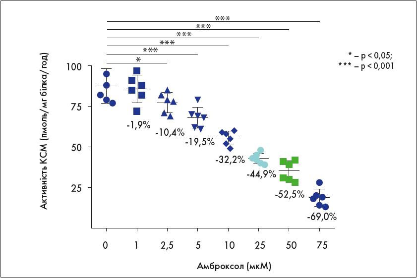 Для перевірки здатності амброксолу інгібувати КСМ вчені інкубували епітеліальні клітини Vero-E6 зі зростаючими дозами препарату і визначали активність КСМ в клітинних лізатах. Виявлено, що амброксол індукував дозозалежне зниження активності КСМ в клітинах Vero-E6 (рис. 1).