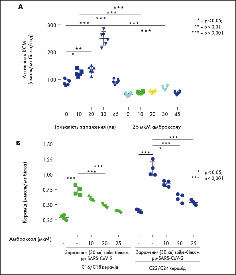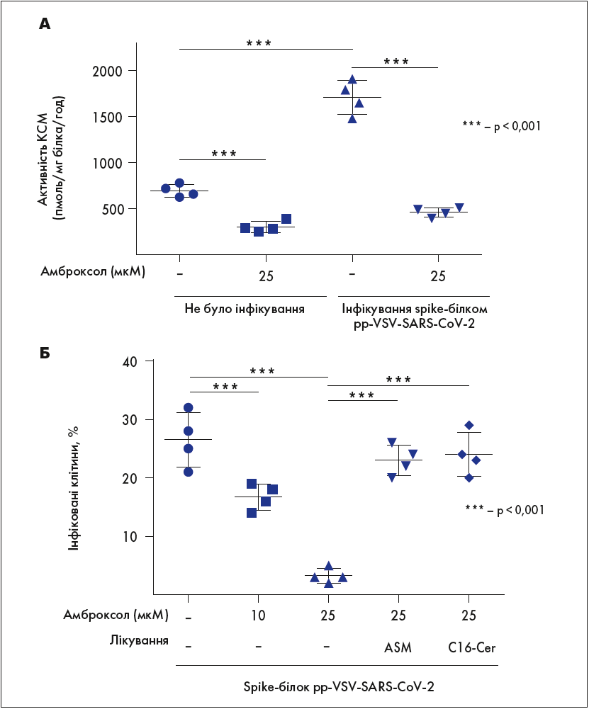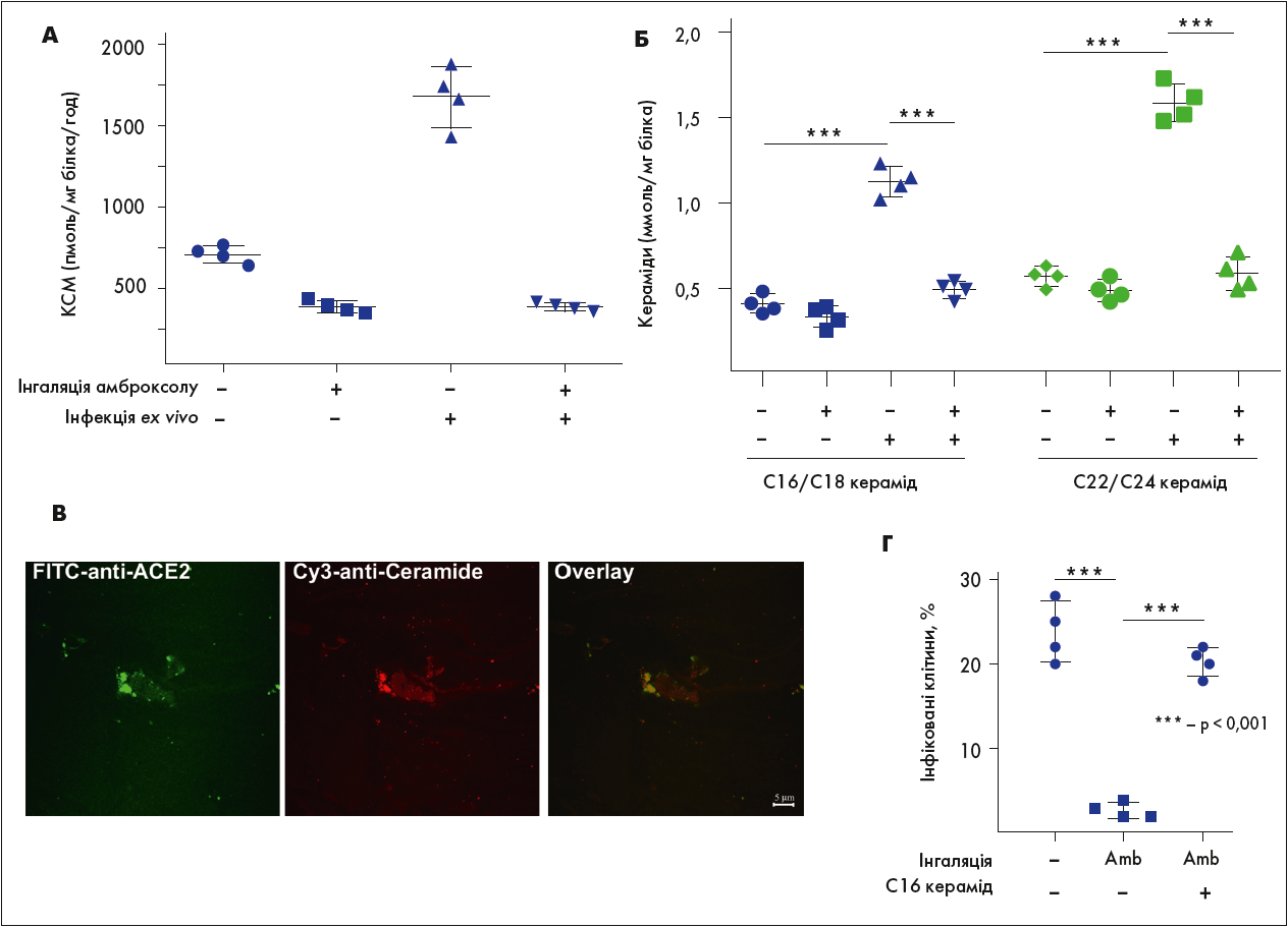 Зараження клітин Vero-E6 spike-білком pp-VSV-SARS-CoV‑2 призводило до вивільнення керамідів C16/C18 і C22/C24, тоді як попередня обробка амброксолом запобігала вивільненню кераміду: 15-20 мкМ амброксолу зменшувало або майже повністю блокувало вивільненя кераміду при зараженні клітин (рис. 2, Б).