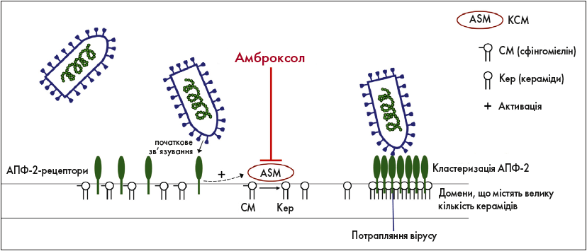 За матеріалами Carpinteiro A. et al. Inhibition of acid sphingomyelinase by ambroxol prevents SARS-CoV‑2 entry into epithelial cells. J. Biol. Chem. V. 296, 100701, Jan 2021. DOI: https://doi.org/10.1016/j.jbc.2021.100701
