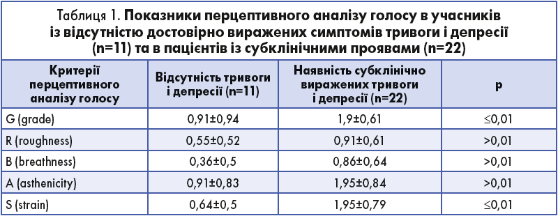 При цьому в пацієнтів із відсутністю достовірно виражені симптоми тривоги і депресії (n=11) ЧМФ становив 13,18±0,22 с., у пацієнтів із субклінічно вираженими тривогою і депресією (n=22) –11,09±1,38 с., показники перцептивного аналізу голосу в обох групах наведені в таблиці 1.
