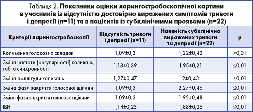 У пацієнтів із субклінічно вираженими тривогою і депресією виявлено достовірне збільшення показників частоти коливань голосових складок на 39,49% (р≤0,01), амплітуди коливань – на 36,5% (р≤0,01), фази закриття голосової щілини – на 51,98% (р≤0,01), фази відкриття – на 44,1% (р≤0,01), ІВН – на 39,36% (р≤0,01), що свідчить про порушення вібраторного циклу фонації гортані, зумовлені наявністю субклінічних психологічних розладів.