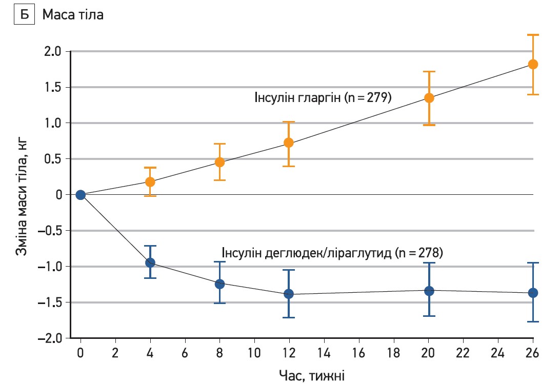 Різниця між лікуванням щодо зміни рівня HbA1c (-0,59%; р<0,001) також відповідала критерію статистично значущої переваги комбінації деглюдек/ліраглутид над гларгіном (табл. 1; рис. 1). Окрім того, в групі комбінації деглюдек/ліраглутид спостерігали зниження маси тіла на 1,4±3,5 кг (із 88,3±17,5 до 86±17,2 кг), тоді як у групі гларгіну вона зросла на 1,8±3,6 кг (із 87,3±15,8 до 89,1±15,9 кг); це відповідає різниці між лікуванням -3,20 кг (р<0,001; табл. 1, рис. 1Б). Підтверджену гіпоглікемію спостерігали в меншої кількості пацієнтів групи комбінації деглюдек/ліраглутид порівняно з хворими групи гларгіну (28,4 проти 49,1% відповідно). Так само в групі комбінації деглюдек/ліраглутид кількість епізодів гіпоглікемії на 1 пацієнта на рік була меншою, ніж у групі гларгіну (2,23 проти 5,05 епізоду відповідно), що відповідає зниженню відносного ризику гіпоглікемії на 57% у разі лікування комбінацією деглюдек/ліраглутид (р<0,001; табл. 1, рис. 1В). У дослідженні зафіксували тільки один епізод тяжкої гіпоглікемії – у групі гларгіну. Усі аналізи чутливості продемонстрували подібні результати стосовно статистичної значущості й розміру ефекту.