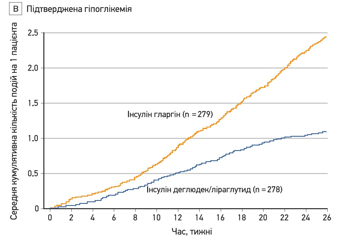 Нічні підтверджені епізоди глікемії спостерігали у 24,4% хворих групи гларгіну й тільки в 6,1% пацієнтів групи комбінації деглюдек/ліраглутид, що відповідає кількості подій на 1 пацієнта на рік 1,23 та 0,22 відповідно. Відносний ризик нічної глікемії в групі комбінації деглюдек/ліраглутид був на 83% нижчим, аніж у групі гларгіну (р<0,001; рис. 2В).