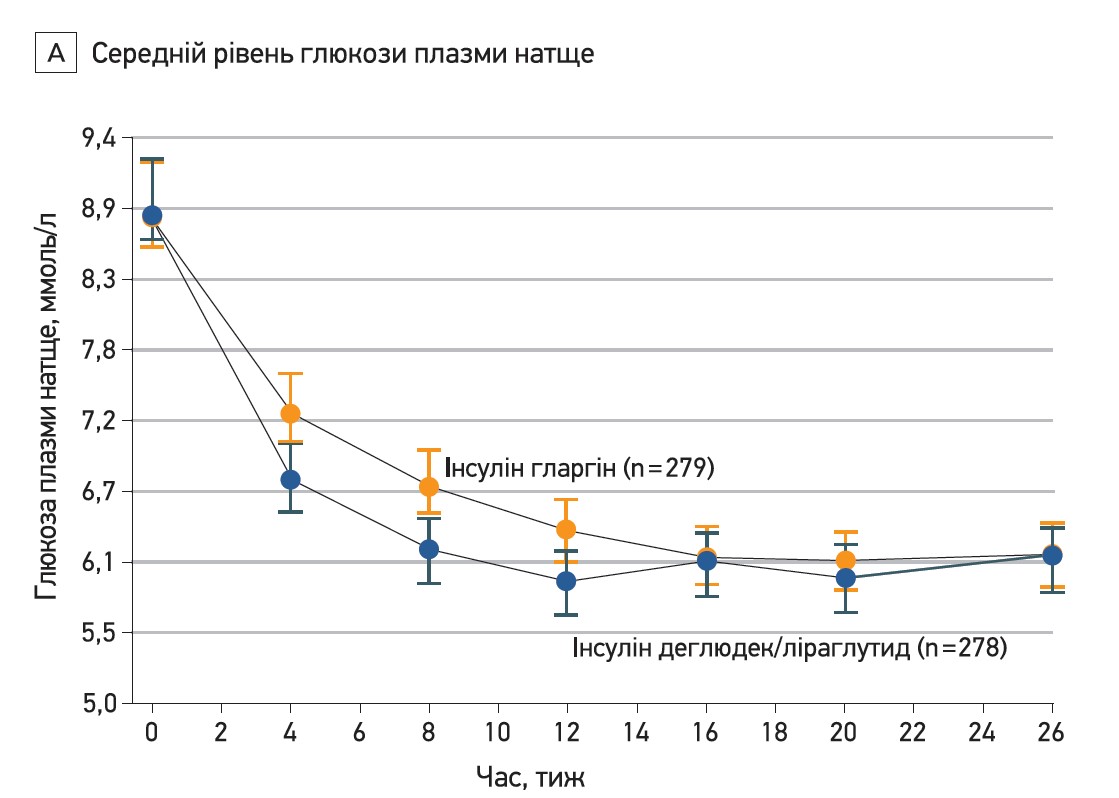 Вихідний рівень HbA1c становив 8,4% у групі комбінації деглюдек/ліраглутид та 8,2% у групі гларгіну. Цей показник знизився протягом перших 16 тиж лікування й на 26-му тижні стабілізувався до 6,6 та 7,1% відповідно. Загалом після 26 тиж терапії середній рівень HbA1c знизився на 1,81% у групі комбінації деглюдек/ліраглутид й на 1,13% у групі гларгіну, що відповідає різниці між лікуванням -0,59% (табл. 1; рис. 1А) з доведеною принаймні не гіршою ефективністю комбінації деглюдек/ліраглутид порівняно з гларгіном (р<0,001).