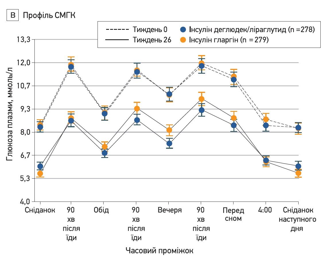 В обох групах після 26 тиж лікування також знизилися середні показники СВГК, виміряні в 9 точках часу: на 2,53±2,41 до 7,56±1,92 ммоль/л у групі комбінації деглюдек/ліраглутид та на 2,36±2,75 до 7,85±1,87 ммоль/л у групі гларгіну. Різниця між лікуванням становила -0,22 (95% довірчий інтервал (ДІ) від -0,53 до 0,09; рис. 2Б).