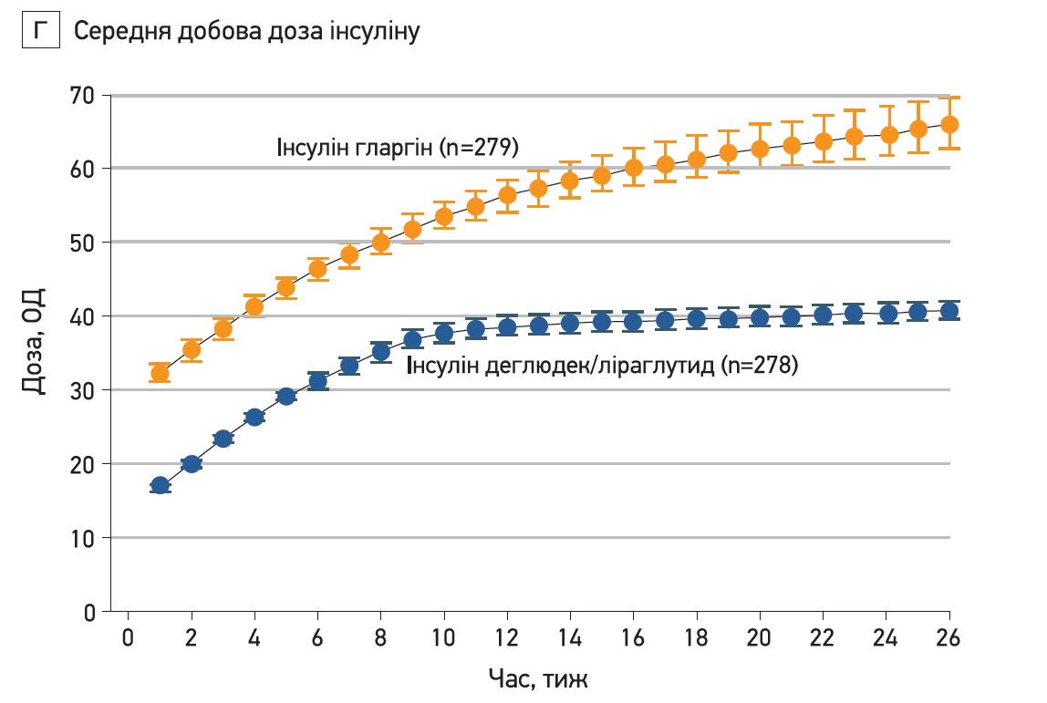Після 26 тиж лікування рівні ГПН знизилися до 6,07±2,13 ммоль/л у групі комбінації деглюдек/ліраглутид та 6,12±2,12 ммоль/л у групі гларгіну (р=0,96; рис. 2А). Середні рівні СВГК, які вимірювали з метою титрації дози, знизилися в обох групах протягом перших 12 тиж терапії (більшою мірою в групі комбінації деглюдек/ліраглутид) та стабілізувалися до 26-го тижня на 5,87±1,44 ммоль/л у групі комбінації деглюдек/ліраглутид та 5,59±1,32 ммоль/л у групі гларгіну.