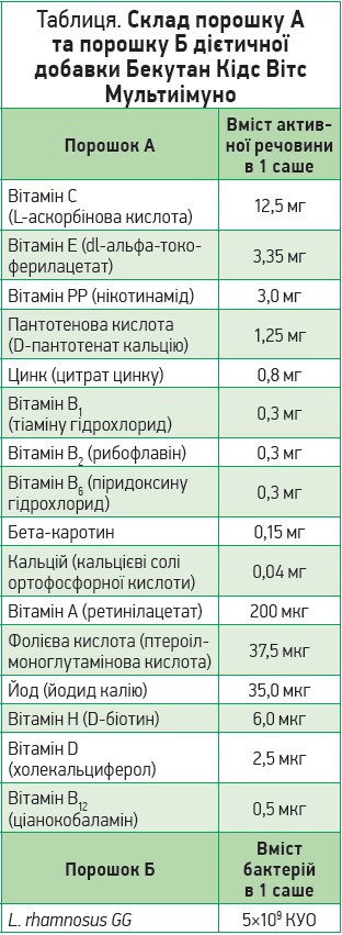 Деякі нутрицевтики дозволяють покращити стан і функцію власної імунної системи з метою збільшення стійкості до вірусних інфекцій та полегшення перебігу хвороб. До таких засобів належить, зокрема, Бекутан Кідс Вітс Мультиімуно (компанія «Алкалоід АД Скоп’є», Республіка Північна Македонія). Бекутан Кідс Вітс Мультиімуно являє собою дієтичну добавку з ароматом апельсина, що містить комбінацію вітамінів, мінералів і пробіотик. Продукт представлений у формі подвійного саше із двома окремими відсіками, кожен із яких містить інший порошок. Обидва порошки мають розчинятися одночасно. Один відсік містить порошок із вітамінами та мінералами (порошок А); в іншому міститься пробіотик Lactobacillus rhamnosus GG (порошок Б) (табл.). Розчинний порошок Бекутан Кідс Вітс Мультиімуно сприяє підтримці імунітету в дітей. Вітаміни А, В6, С, D і фолієва кислота беруть участь у функціонуванні імунної системи. Крім того, вітаміни С та Е сприяють захисту клітин від окисного стресу. L. rhamnosus GG впливає на імунітет за рахунок відновлення балансу мікрофлори кишечнику.