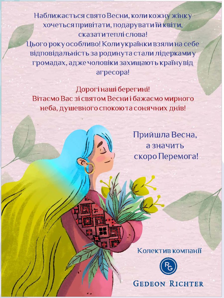 Минулий рік виявився складним і переломним у житті кожного українця. Однак найсерйознішим викликам, які спіткали долю нашої країни за весь період її незалежності, ми дали гідну відповідь. Спільне лихо згуртувало наш народ, який переконливо продемонстрував усьому світу свою єдність, незламність та віру в справжні цінності. Безсумнівно, значний внесок у майбутню довгоочікувану перемогу зробили лікарі, яким у надзвичайно складних умовах доводилося рятувати життя нашим військовим і надавати медичну допомогу постраждалим цивільним громадянам. До повномасштабної війни жінки складали 83% медичних працівників в Україні. І зараз вони продовжують відігравати центральну роль у реагуванні на виклики війни, борючись за здоров’я людей. Отже, напередодні Міжнародного жіночого дня компанія Gedeon Richter вітає наших славних жінок, на тендітні плечі яких лягли нелегкі турботи про здоров’я громадян і котрі самовіддано продовжують працювати на ниві охорони здоров’я. Це – чудове свято, що дарує радість, тепло, доброту, ніжність та надію на відродження нашої країни.