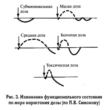 Фундаментальные исследования, которые связывали развитие различных фаз действия фармакологических средств и величину назначаемой дозы, провел советский ученый П.В. Симонов (рис. 3). Он проверил и в значительной степени дополнил уже упоминавшееся правило Арндт-Шульца, сформулировав следующие положения: «По мере нарастания дозы (силы) различных воздействий (кофеин, химические стимуляторы лейкоцитарных реакций, проникающее излучение, механическая травма) наблюдается три фазы изменения безусловных реакций: начальное угнетение, возбуждение и вторичное (запредельное) торможение. Глубина и продолжительность этих фаз зависят от силы воздействия». Следовательно, угнетающее (тормозящее) действие оказывают не только дозы, которые больше, но и те, которые меньше доз, вызывающих стимуляцию (возбуждение) функции. Заметим, что результаты, полученные учеными в дальнейшем, обнаружили еще одну закономерность, на которой он не акцентировал внимания. Введение кофеина всегда действовало двухфазно – сначала стадия возбуждения, затем торможения; в зависимости от дозы продолжительность этих разнонаправленных эффектов была различной. Такая закономерность очень важна. «Можно полагать, что именно ее эмпирически используют гомеопаты в тех случаях, когда они получают достаточный терапевтический эффект», – писал Симонов. Он приводит целый ряд примеров противоположной направленности действия малых доз по сравнению со средними. Слабые химические раздражители заставляют амебу принять шарообразную форму, втянуть ложноножки, двигательная активность ее подавляется. Увеличение концентрации кислоты или соли повышает ее двигательную активность, она стремится удалиться от химического раздражителя.