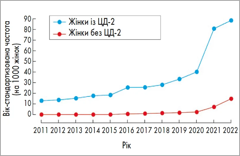 Рис. 1. Частота першого призначення агоністів рецепторів GLP‑1 жінкам віком 18-49 років за статусом ЦД‑2 (2011-2022 рр.)