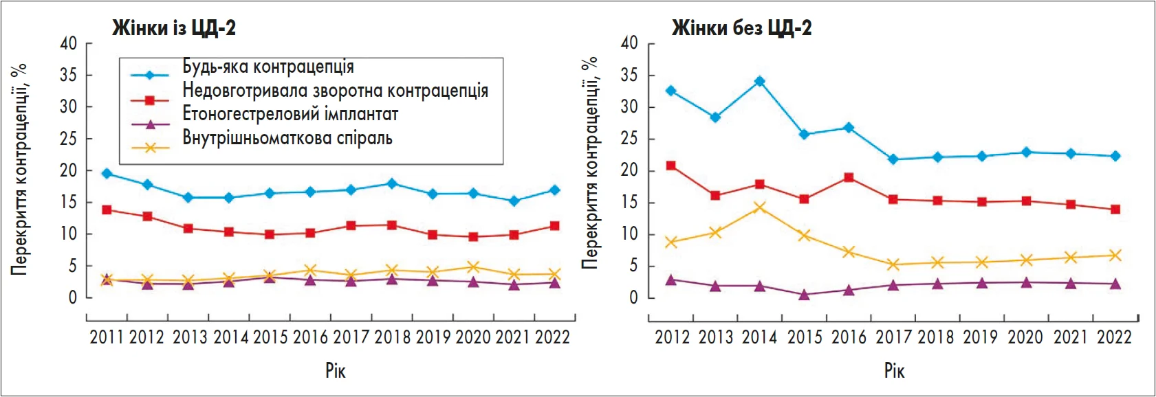 Нижче покриття контрацепцією серед жінок із ЦД‑2 особливо занепокоює через їхню більшу потребу в преконцепційній допомозі та підвищений ризик несприятливих наслідків вагітності [28]. Причини низького рівня контрацепційного покриття можуть бути пов’язані з обмеженою обізнаністю про ризики, пов’язані з використанням агоністів рецепторів GLP‑1 під час вагітності, або сприйняттям зниженої фертильності у жінок із ЦД‑2, синдромом полікістозних яєчників чи ожирінням [29].