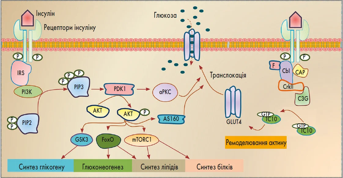 Інсулін виконує свої функції в інсулінозалежних тканинах через своє зв’язування з рецептором інсуліну (INSR), який активує його нижчі сигнальні шляхи (рис. 1). Інсулін має анаболічний ефект, оскільки сприяє синтезу глікогену, ліпідів і білків, а також інгібує процеси глюконеогенезу та ліполізу [6]. Він також сприяє внутрішньоклітинному поглинанню глюкози через транслокацію інсулінозалежного транспортера глюкози (GLUT4), як у скелетних м’язах так, і в жировій тканині [7]. Ця метаболічна дія інсуліну досягається через шлях фосфатидилінозитол‑3-кінази (PI3K) [8].