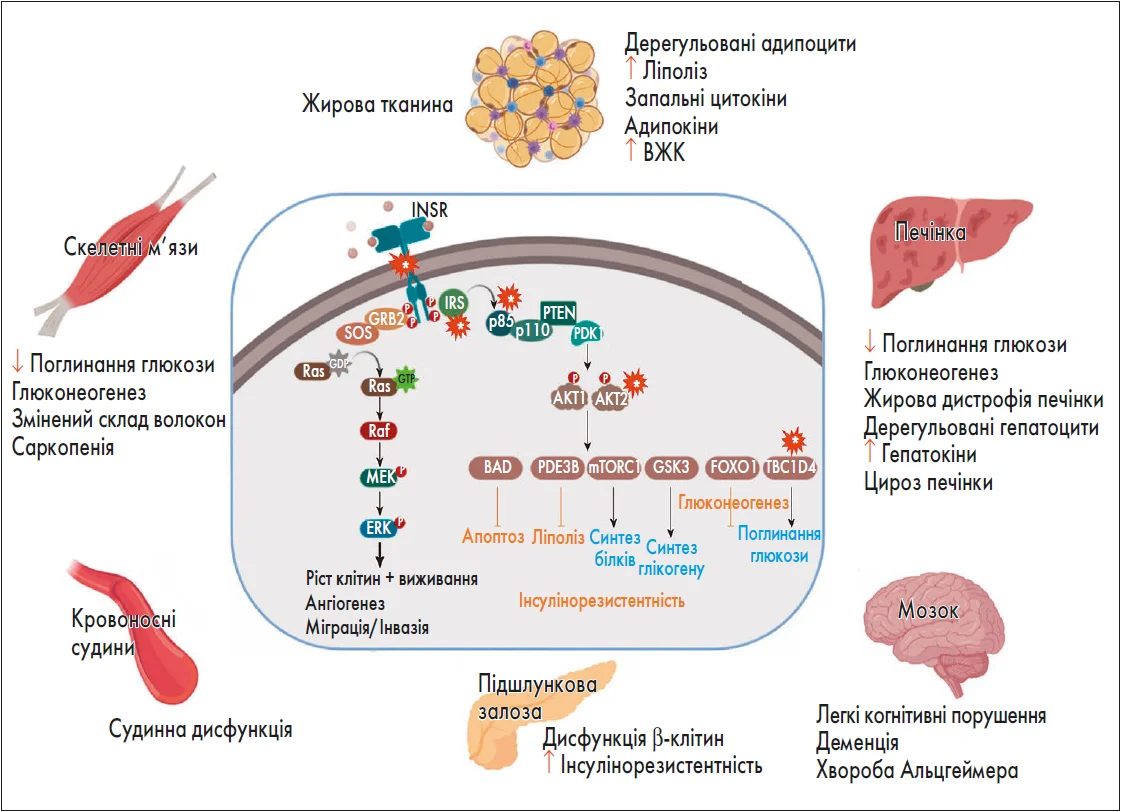 Метаболізм глюкози регулюється зворотним зв’язком між β-клітинами острівців та інсулінозалежними тканинами. За умов інсулінорезистентності β-клітини контролюють нормальну толерантність до глюкози шляхом збільшення рівня секреції інсуліну [2]. Інсулінорезистентність у різних тканинах (жирова тканина, скелетні м’язи, печінка, мозок, кишечник, підшлункова залоза, судини та нирки) призводить до кількох метаболічних розладів, включаючи ЦД‑2, серцево-судинні захворювання, гіпертензію, синдром полікістозних яєчників, жирову інфільтрацію печінки, неалкогольну жирову хворобу печінки, апное, розлад сну, артрит, шкірні захворювання та рак.