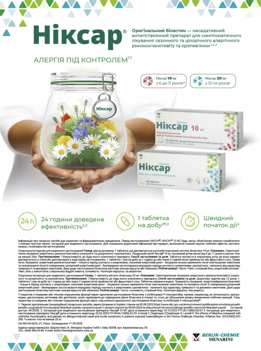 Питання безпеки залишається ключовим під час вибору терапії у педіатричній практиці. Біластин продемонстрував високий профіль безпеки в різних вікових категоріях дітей, що є принципово важливим для педіатра. На сьогодні препарат зареєстрований для застосування із шести років (у світі – з двох років) у формі легкодисперсованих таблеток, які швидко розчиняються в слині або воді. Режим дозування передбачає одноразовий прийом на добу: 10 мг для дітей від 6 до 11 років та 20 мг для дітей із 12 років. Ніксар® може розглядатися як препарат вибору для лікування ХА у дітей із шестирічного віку.