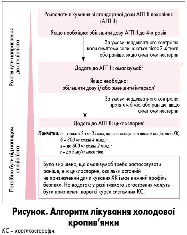 Оскільки холодова кропив’янка належить до ХК, менеджмент таких пацієнтів ґрунтується на відповідних алгоритмах (рис.). Першим кроком є призначення антигістамінних препаратів (АГП) другого покоління у стандартних дозах. Якщо через два тижні контролю не досягнуто, застосовують режим підвищення дози – збільшення до чотириразової. За недостатньої ефективності рекомендоване поєднання АГП з омалізумабом, водночас залежно від відповіді пацієнта можна збільшувати дозу або зменшувати інтервал між введеннями. У резистентних випадках розглядають імуносупресивну терапію циклоспорином.