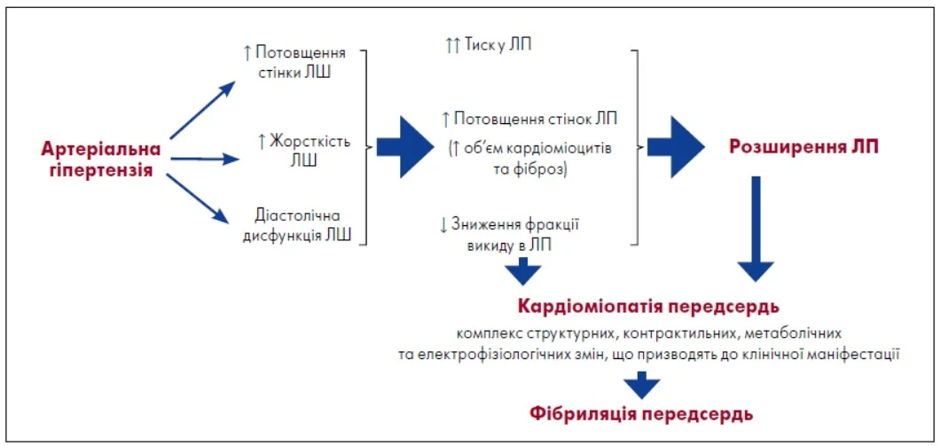 АГ спричиняє структурне ремоделювання міокарда, що спершу проявляється змінами у ЛШ, а згодом – дилатацією ЛП та розвитком гіпертензивної кардіоміопатії. У підсумку це створює умови для формування і підтримання ФП (рисунок).