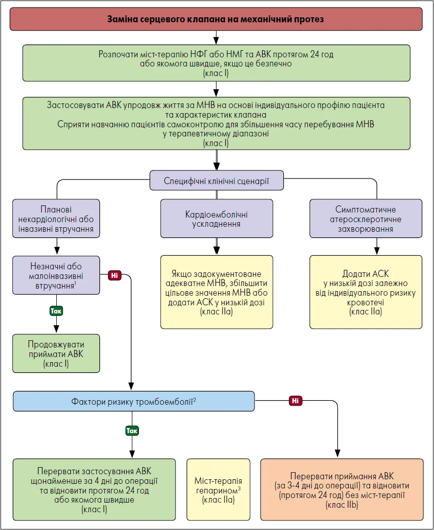 Примітки: 1 Операції на шкірі; незначні офтальмологічні операції, включно із видаленням катаракти; чищення, видалення зубів, лікування карієсу; імплантація кардіостимулятора або іншого пристрою; діагностична катетеризація серця. 2 Встановлення МСК замість мітрального або трикуспідального клапана, МСК більш раннього покоління замість будь-якого серцевого клапана, спадкова або набута гіперкоагуляція, дисфункція ЛШ (ФВ ЛШ <35%), ФП зі значним МС, нещодавня (<12 місяців) серйозна тромботична подія (наприклад, кардіоемболічний інсульт, тромбоз глибоких вен, тромбоемболія легеневої артерії). 3 Міст-терапію необхідно розпочинати, щойно МНВ досягне субтерапевтичного значення, та в перший день після операції або коли це буде безпечно.