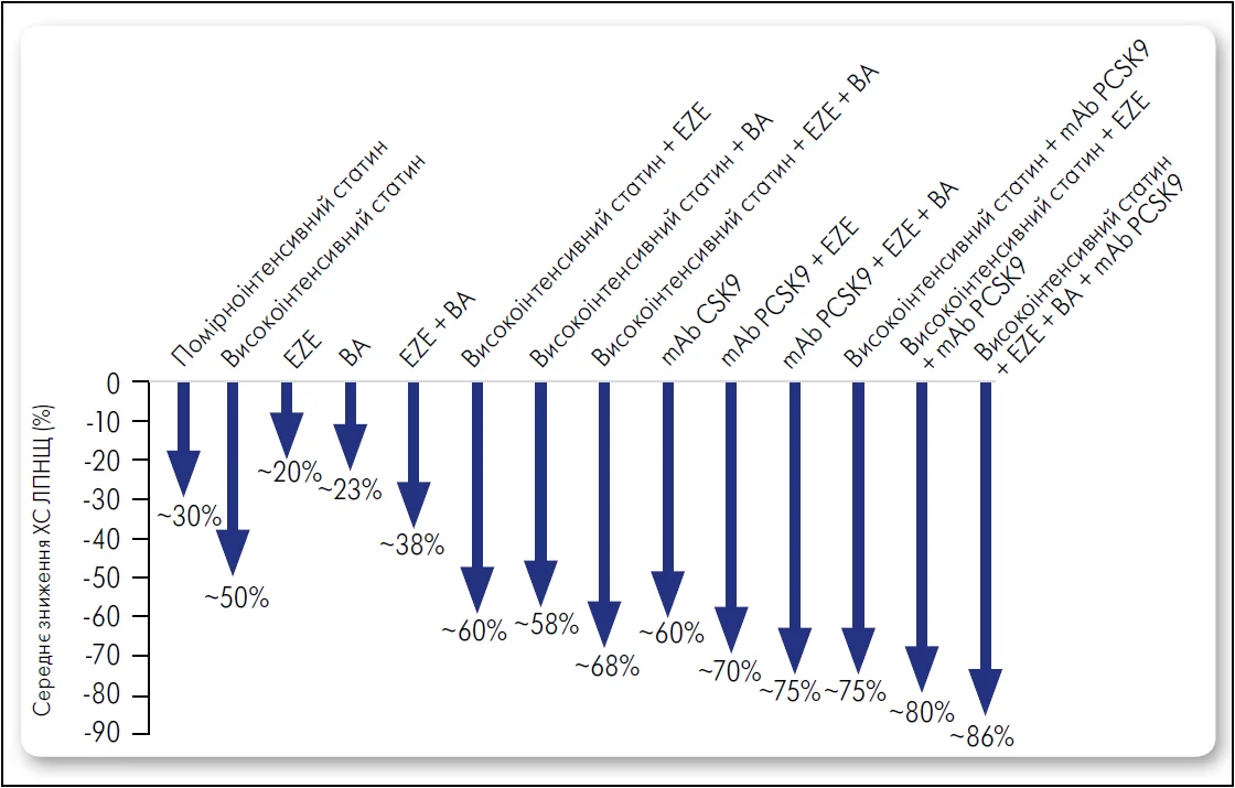 Примітки: EZE – езетиміб, BA – бемпедоєва кислота, mAbP РCSK9 – моноклональні антитіла до РCSK9.