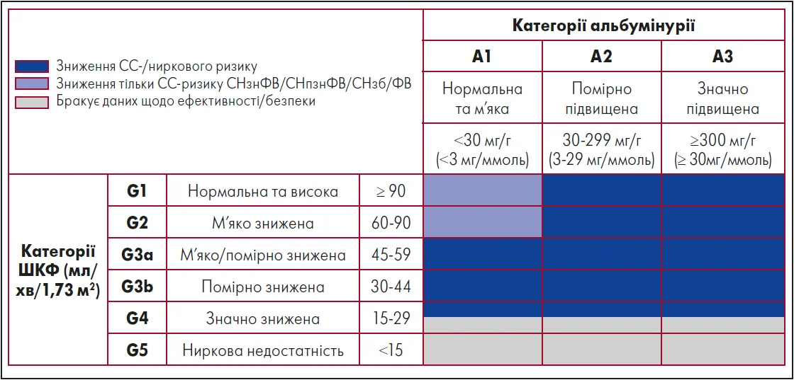 Рис. 2. Показання до застосування іНЗКТГ‑2 при ХХН / альбумінурії / ЦД 2-го типу/ СНзнФВ / СНпзнФВ / СНзбФВ: алгоритм Cold Map
