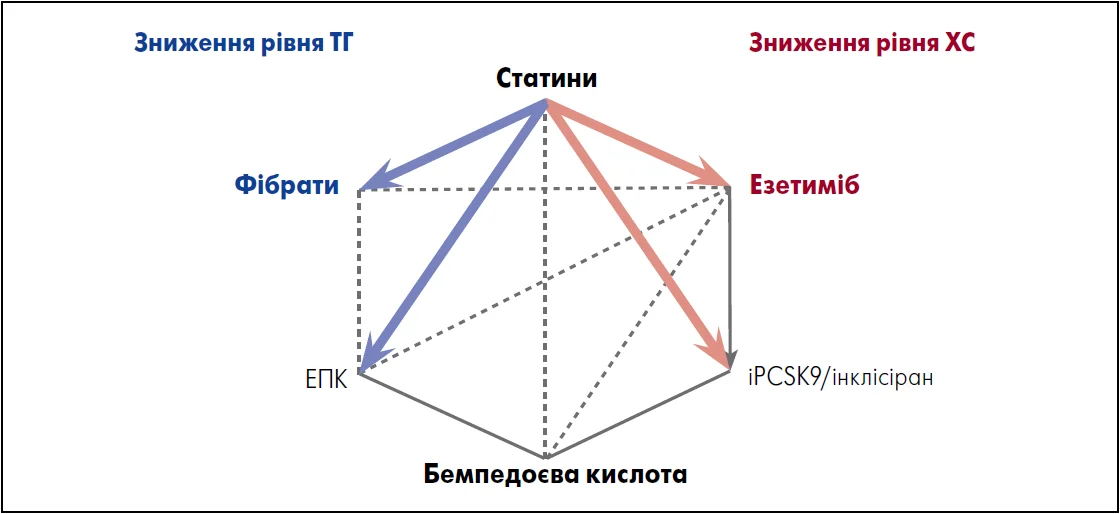 Рис. 1. Можливі комбінації препаратів, що застосовуються в лікуванні дисліпідемії