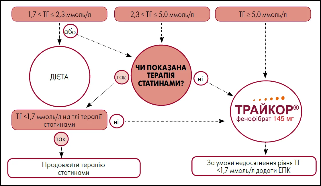 З огляду на роль ТГ-збагачених ліпопротеїнів у формуванні резидуального ризику, сучасні підходи до лікування дисліпідемії передбачають не лише досягнення цільових рівнів ХС ЛПНЩ, але й корекцію ГТГ. Основою терапії залишаються статини, які є препаратами першої лінії у пацієнтів із високим ризиком ССЗ. Якщо на тлі їх застосування досягнуто цільового рівня ХС ЛПНЩ, але зберігається підвищений рівень ТГ (>2,3 ммоль/л), рекомендації передбачають можливість призначення додаткової терапії – фенофібрату або ейкозапентаєнової кислоти (ЕПК) (ESC, 2021).