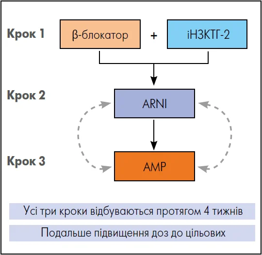 Примітки: АТ – артеріальний тиск, ШКФ – швидкість клубочкової фільтрації 1 Також див. інструкції щодо медичного застосування препаратів 2 Максимальна доза 50 мг двічі на добу є рекомендованою, якщо маса тіла пацієнта >85 кг 3 Для пацієнтів із симптоматичною гіпотензією в анамнезі або для літніх чи ослаблених осіб можна розглянути використання ARNI у нижчій початковій дозі 24/26 мг двічі на день 4 Для літніх чи ослаблених хворих можна розглянути АМР у нижчій початковій дозі 12,5 мг/добу. Рекомендовано не розпочинати терапію АМР, якщо ШКФ <30 мл/хв/1,73 м2; може бути доцільно продовжувати застосування АМР, якщо ШКФ зменшується нижче цього порогу |