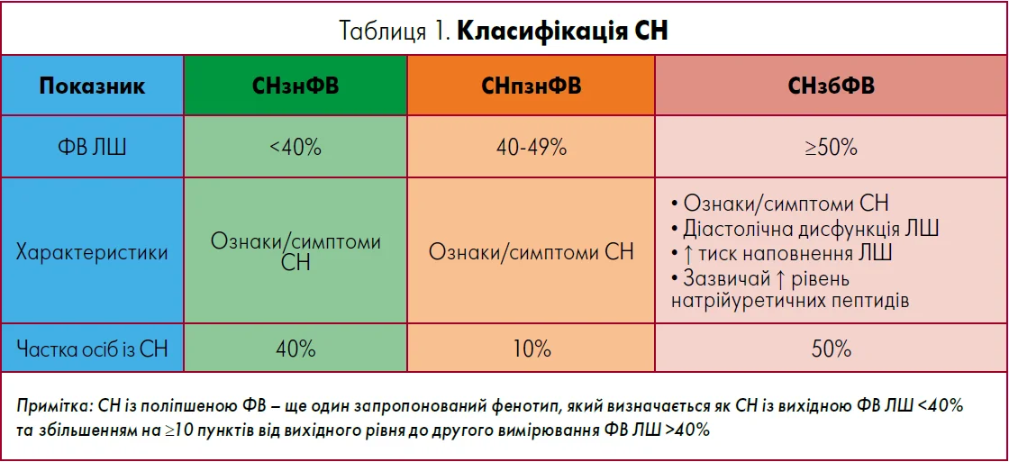 Хронічна СН – це захворювання, що характеризується недостатнім серцевим викидом. Протягом десятиліть СН класифікувалася за зміною функції лівого шлуночка (ЛШ), але у 2021 р. провідні міжнародні наукові організації розробили консенсусну класифікацію, яка розділяє її на СН зі зниженою фракцією викиду (СНзнФВ), СН із помірно зниженою ФВ (СНпзнФВ) та СН зі збереженою ФВ (СНзбФВ). Лікарі первинної ланки мають достеменно розбиратися у класифікації СН (табл. 1), оскільки діагностика й терапія для різних фенотипів СН варіюють. Ризик смерті від усіх причин є найвищим протягом перших тижнів після першого звернення пацієнта до лікаря із приводу СН. Тому швидкі дії в межах первинної медичної допомоги дійсно важливі.