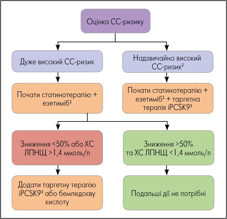 Примітки: 1 У пацієнтів із непереносимістю статинів слід розглянути таргетну терапію езетимібом і бемпедоєвою кислотою або інгібіторами пропротеїнової конвертази субтилізин-кексинового типу 9 (іPCSK9). 2 Надзвичайно високий ризик = стан після гострого коронарного синдрому + інші судинні події / ЗПА / поліваскулярна патологія / багатосудинне захворювання коронарних артерій / сімейна гіперхолестеринемія в анамнезі. 3 Моноклональні антитіла проти PCSK9 або мала інтерферуюча РНК, що пригнічує синтез PCSK9.