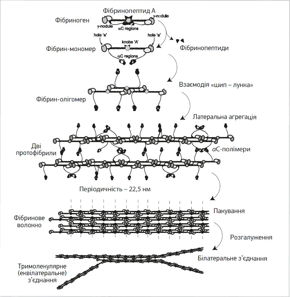 Фібриноген є білком, що синтезується в печінці та циркулює в плазмі, а також в α-гранулах тромбоцитів. Це гетеродимер, який складається із трьох різних типів поліпептидів (Aα-, Bβ- та γ-ланцюгів), з’єднаних дисульфідними зв’язками. Тромбін (фермент зі слабкими протеолітичними властивостями) розщеплює N-кінці Aα- та Bβ-ланцюгів фібриногену, вивільняючи фібринопептиди A і B. Це дозволяє отриманому мономеру фібрину полімеризуватися шляхом асоціації карбоксильних груп. Спочатку полімеризація мономерів фібрину відбувається в нитках завтовшки як два мономери фібрину, де бічні карбоксильні групи дволінійно розташованих молекул утворюють оболонку; обидві прив’язуються, перекриваючись до N-кінців третього мономеру, що спричиняє утворення дволанцюгової протофібрили. Латеральна агрегація протофібрил (олігомери фібрину, що складаються із 20-25 мономерів) стимулюється гомофільними αC-αC-взаємодіями всередині та між протофібрилами, включаючи утворення αC-полімерів. Упакування протофібрил у волокно відбувається з періодичністю 22,5 нм завдяки молекулярній структурі та паракристалічному розташуванню [3] (рис. 1).