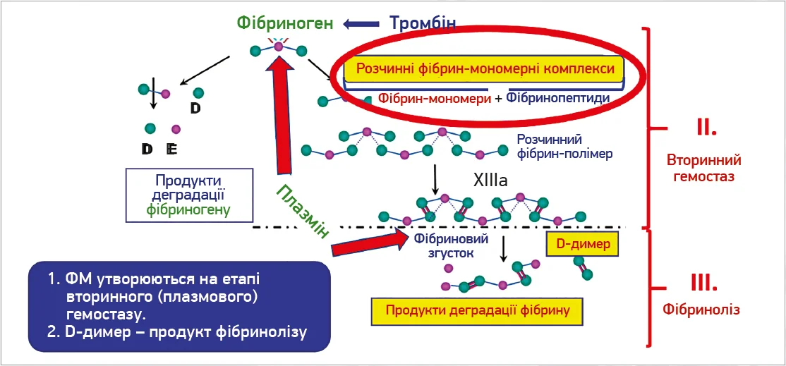 Рівень ФМ у плазмі – відображення активного тромбіну в судинах. Оскільки їхнє вироблення не залежить від фібринолізу плазміном на відміну від D-димеру, їх часто описують як ранні маркери активації коагуляції in vivo. Механізм утворення ФМ продемонстровано на рисунку 3.