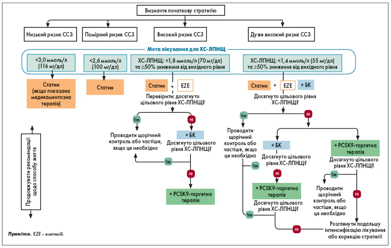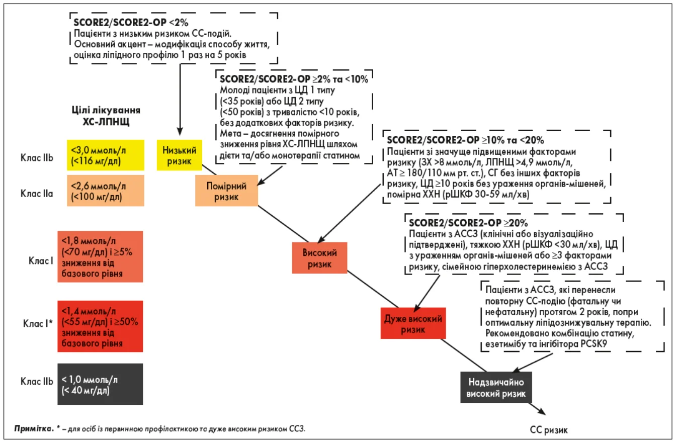 В оновлених рекомендаціях ESC 2025 цілі лікування ліпідних порушень залишаються узгодженими з попередніми принципами: інтенсивність терапії визначається категорією загального ССР. Узагальнений алгоритм подано на рисунку 1.
