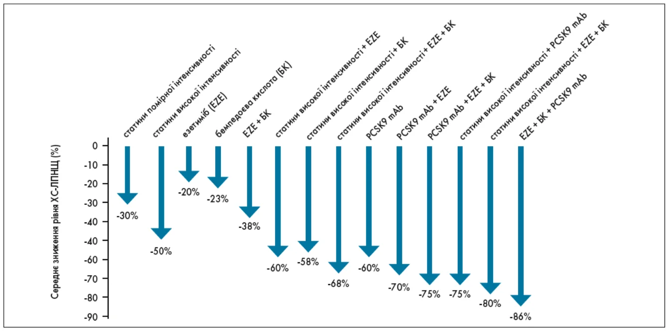 Саме від цільового рівня залежить вибір інтенсивності терапії – від монотерапії статином до комбінованих схем із додаванням езетимібу, бемпедоєвої кислоти (БК) або інгібіторів PCSK9. На рисунку 3 представлено порівняння середнього зниження рівня ХС-ЛПНЩ при застосуванні різних фармакологічних підходів із доведеною користю для серцево-судинної системи (ССС).
