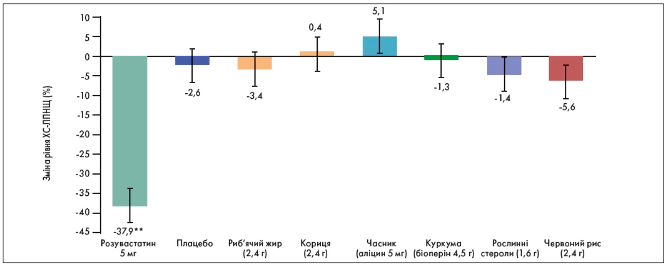 У дослідженні SPORT (Laffin et al., JACC, 2022) порівнювали ефекти розувастатину 5 мг, плацебо та поширених дієтичних добавок – риб’ячого жиру, кориці, часнику, куркуми, рослинних стеролів і червоного рису. Результати показали, що жодна з добавок не продемонструвала значущого зниження рівня ХС-ЛПНЩ, тоді як розувастатин забезпечив його зменшення майже на 38%, що відображено на рисунку 4.