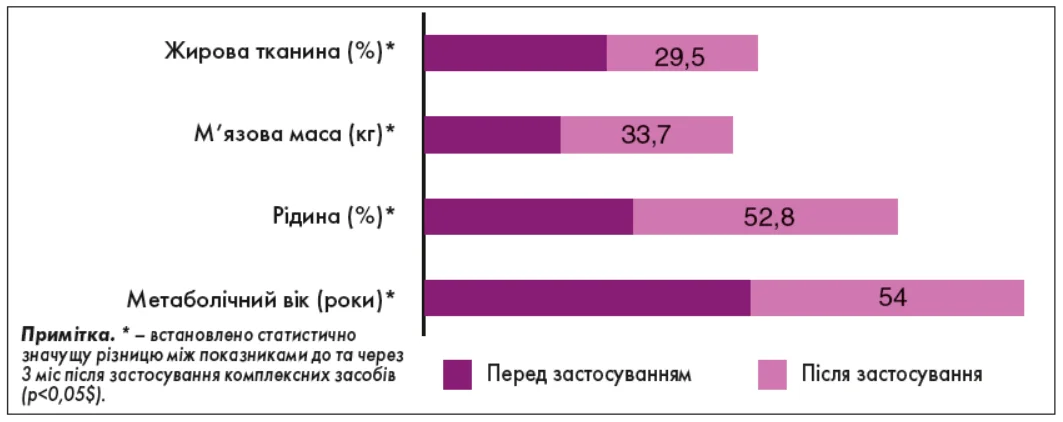 Ці результати також були підтверджені даними біоімпедансометрії, проведеної до початку та через 3 місяці. Найбільша та статистично значуща різниця між показниками складу тіла (вміст жиру, м’язова маса, рідина та метаболічний вік) була встановлена в пацієнтів III групи, які отримували рослинний комплекс та дієтичну добавку. У таблиці 2 представлені ці показники.