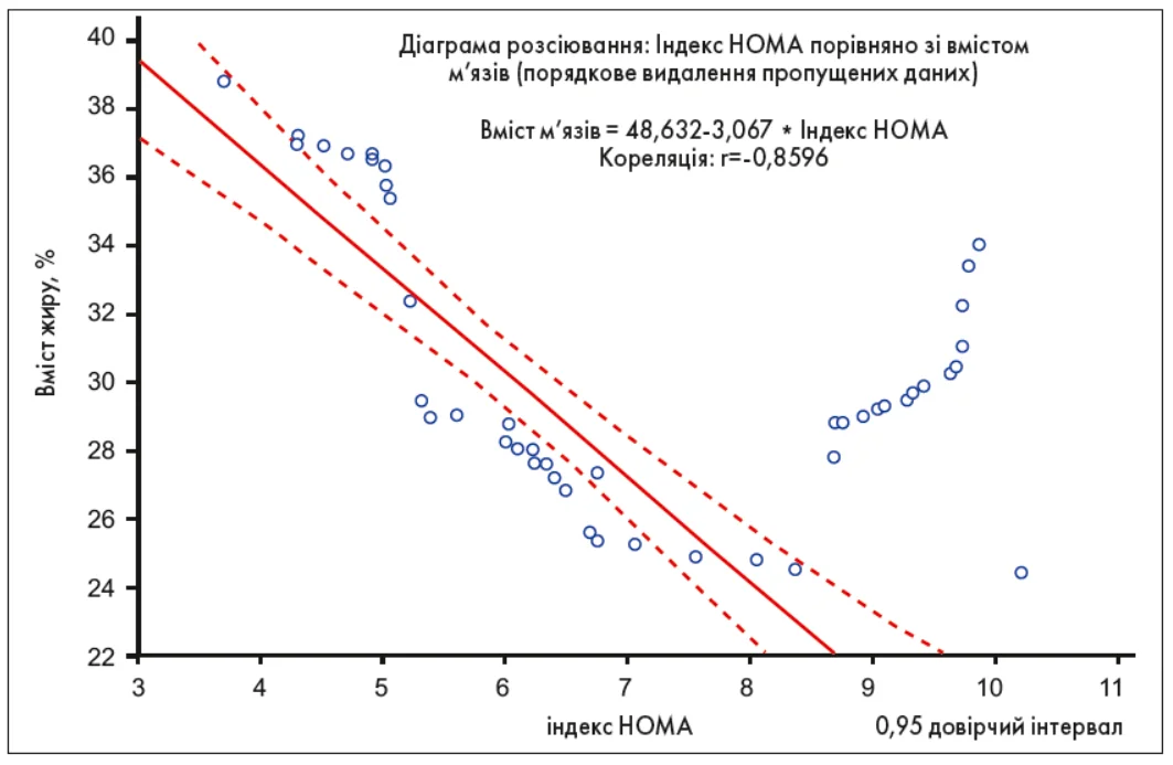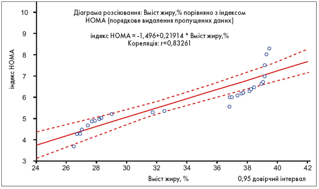 Отже, зі збільшенням ІР у таких пацієнтів спостерігатиметься зростання вмісту жиру в організмі (p=0,01; r=0,83261).