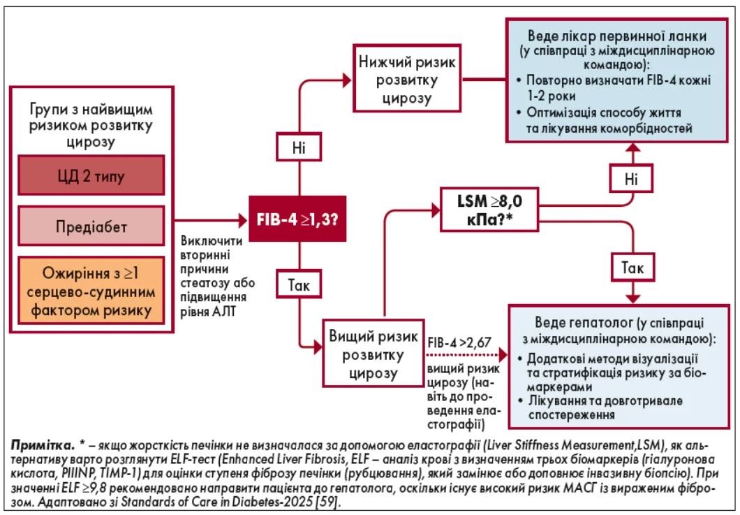 За матеріалами: Kenneth Cusi, Manal F. Abdelmalek, Caroline M. Apovian et al. Metabolic Dysfunction–Associated Steatotic Liver Disease (MASLD) in People With Diabetes: The Need for Screening and Early Intervention. A Consensus Report of the American Diabetes Association, Diabetes Care Volume 48, July 2025.