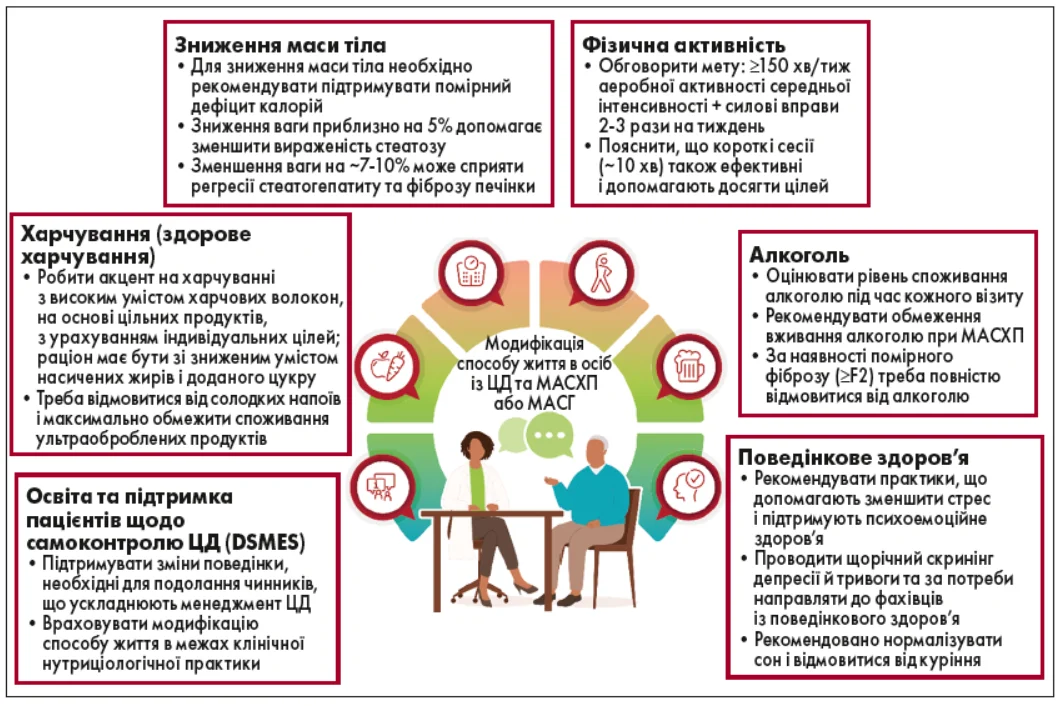Здоровий спосіб життя є базовим компонентом лікування пацієнтів із ЦД 2 типу та МАСХП. На рисунку 3 наведені основні втручання щодо зміни способу життя. У пацієнтів із надмірною масою тіла та ожирінням ступінь зниження ваги зазвичай корелює з покращенням глікемічного контролю, підвищенням чутливості до інсуліну та поліпшенням гістологічної картини при МАСГ, у тому числі зі зменшенням фіброзу [122, 123]. Зменшення маси тіла на ≥5% загальної ваги знижує вираженість стеатозу, тоді як для регресії стеатогепатиту зазвичай потрібне зниження ваги більш ніж на 5% [56, 122, 124, 125]. Дані багатьох досліджень свідчать, що для зменшення вираженості фіброзу нерідко необхідне суттєвіше зниження маси тіла (≥10%), при цьому індивідуальна відповідь може значуще відрізнятися [56, 57, 122, 124].
