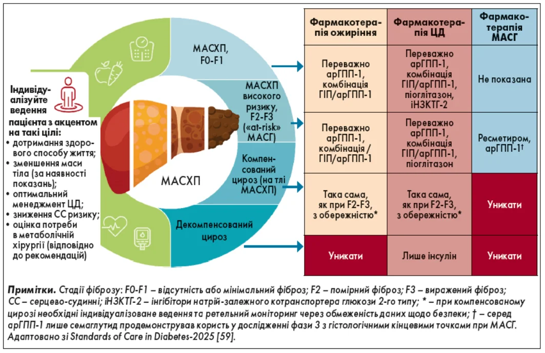 Фармакологічне лікування ожиріння в пацієнтів із МАСХП має бути індивідуалізованим, з оцінкою потенційної користі й ризиків, вартості терапії та регулярним переглядом ефективності обраної стратегії. На рисунку 4 наведено підходи до ведення МАСХП залежно від тяжкості ураження печінки та доступних фармакологічних опцій для лікування ожиріння або ЦД 2 типу, які можуть сприяти регресії стеатогепатиту, а також специфічні засоби для лікування МАСГ (наприклад, ресметиром).