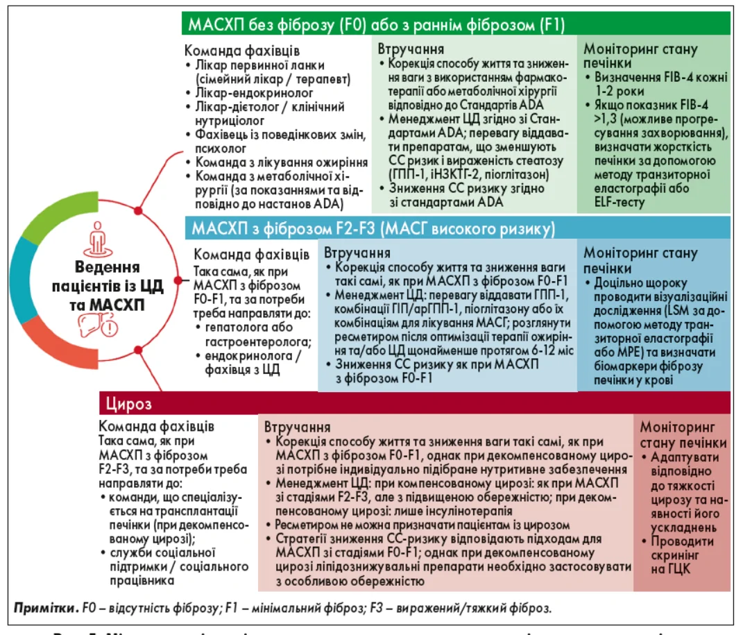 Рис. 5. Міждисциплінарні команди, принципи ведення та моніторинг стану печінки в пацієнтів із ЦД та МАСХП