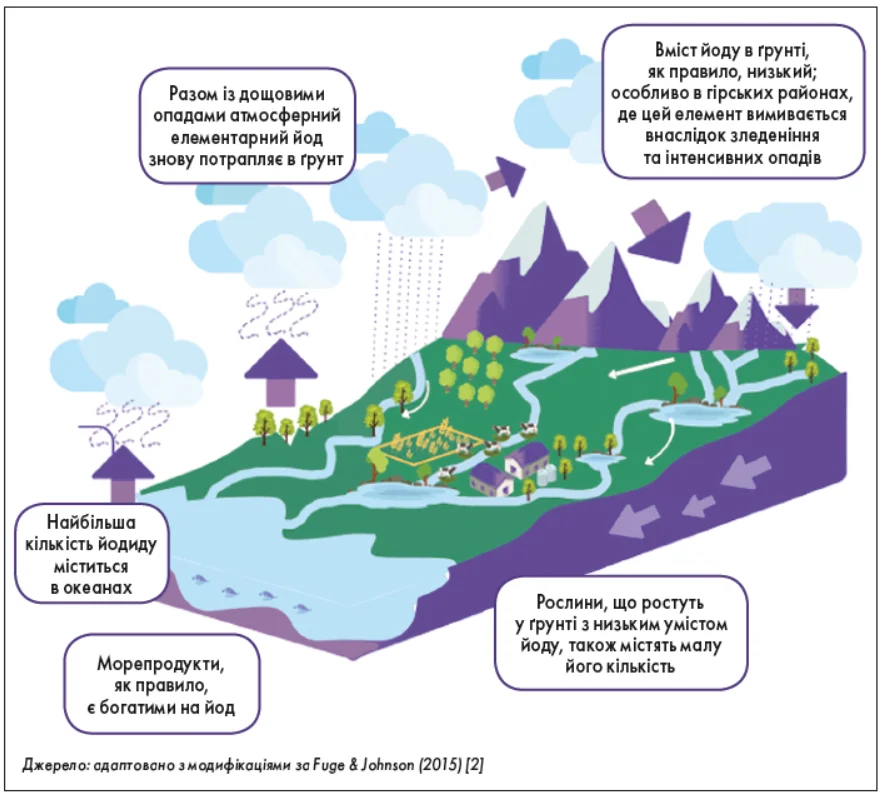 Йод (у формі йодиду, I-) є незамінним мікроелементом, який має надходити з їжею. Його основна фізіологічна роль полягає в тому, що він є складовою тиреоїдних гормонів – тироксину (T4) і трийодтироніну (T3) [1]. Йодний дефіцит виникає внаслідок нестачі йоду в ґрунті та підземних водах, що призводить до низького природного вмісту йоду в місцевих продуктах харчування та питній воді (рис. 1) [2]. Історично йодний дефіцит був широко поширеним у більшості регіонів Європи, особливо в гірських місцевостях, де льодовикові процеси та інтенсивні опади зумовили низьку кількість йоду в ґрунті [3]. Геологічні властивості ґрунтів є здебільшого незмінними, тому контроль йодного дефіциту має бути безперервним процесом.