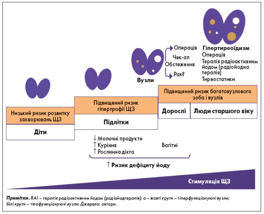 Зоб і вузли ЩЗ. Основними наслідками легкого дефіциту йоду є структурні зміни ЩЗ, спричинені її гіперстимуляцією. Вони характеризуються гіпертрофією ЩЗ і появою вузлів (рис. 2) [54].