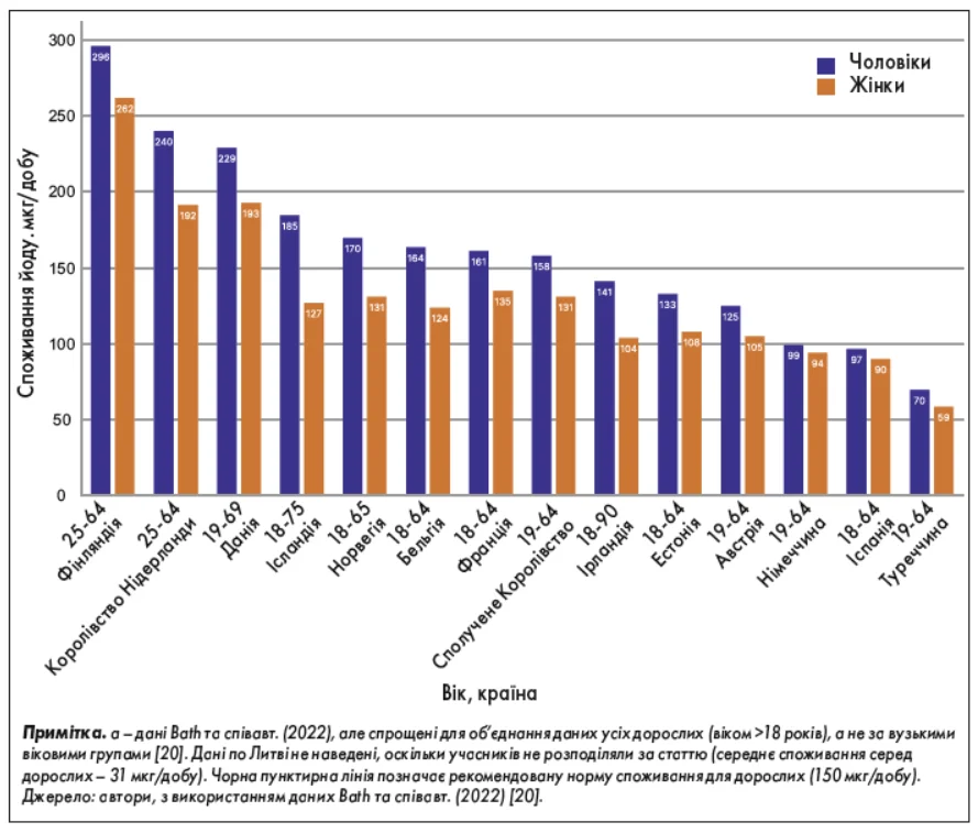 На рисунку 3 підсумовано загальне споживання йоду дорослими чоловіками і жінками окремо, з розподілом за країнами; споживання йоду порівнюють із рекомендованою нормою для дорослих, яка становить 150 мкг/добу. Ці дані не враховують споживання йодованої солі, тому в деяких країнах можуть бути заниженими.