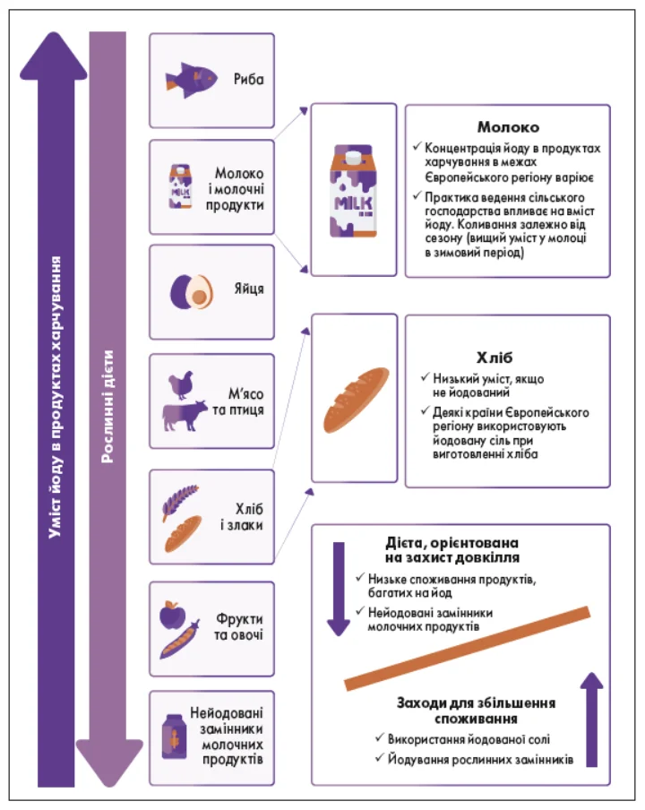 На рисунку 5 показано, що найбільше йоду містять продукти тваринного походження, і, відповідно, якщо ці продукти замінюють рослинні, уміст йоду в раціоні знижується. Споживачі, які дотримуються переважно рослинної дієти, можуть мати підвищений ризик йододефіциту.