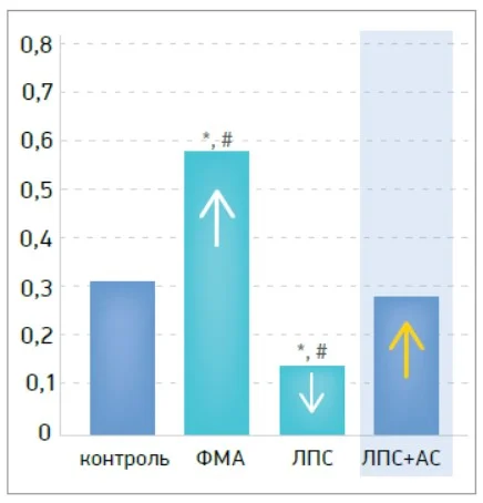 Примітки: АС – Альпесорб; ФМА – форбол‑12-меристат‑13-ацетат; ЛПС – ліпополісахарид; * – достовірність із групою контролю; # – достовірність між Альпесорбом та позитивним контролем.
