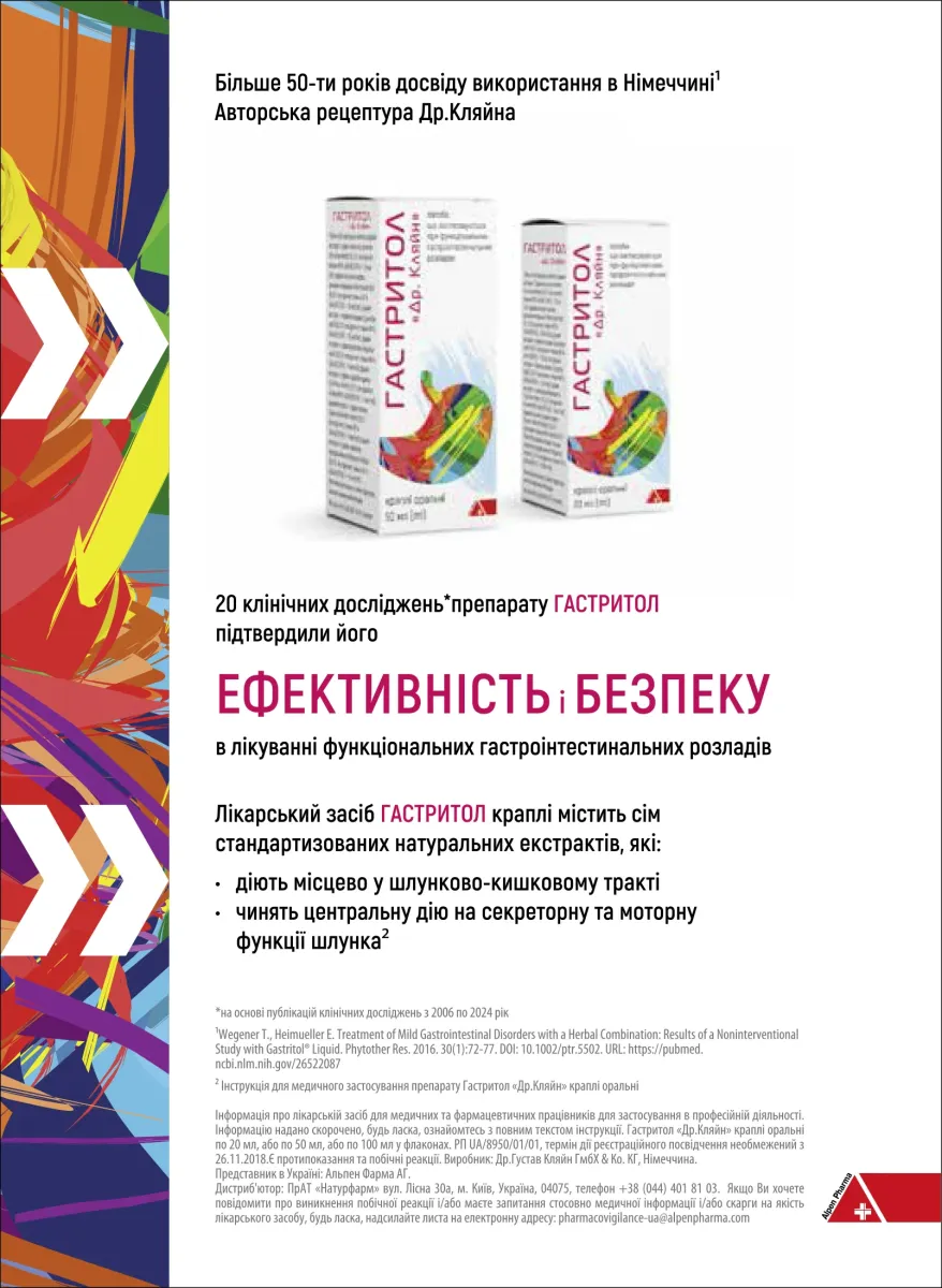 Отже, ведення пацієнтів із поєднанням функціональної диспепсії та функціонального закрепу потребує комплексного підходу з урахуванням усіх патогенетичних механізмів. Застосування фітопрепарату Гастритол® «Др. Кляйн», що діє на моторну функцію і має протизапальний та антифлатулентний ефект, є патогенетично виправданим у таких пацієнтів. Багатокомпонентна фармакологічна активність препарату дає змогу впливати одночасно на різні механізми розвитку симптомів, що особливо важливо при коморбідній патології. Поєднання модифікації способу життя, раціонального використання пробіотиків, харчових волокон і симптоматичних засобів сприяє досягненню оптимальних результатів лікування та покращенню якості життя пацієнтів.