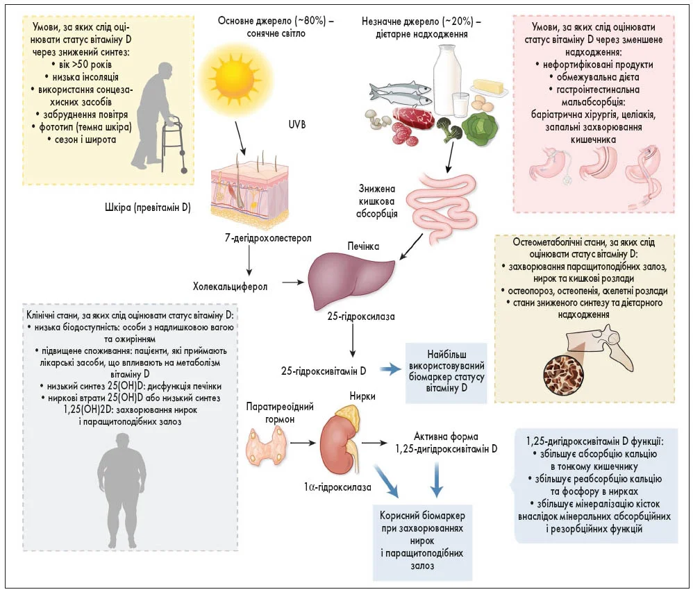 Вітамін D3 синтезується в шкірі з 7-дегідрохолестеролу (7-DHC) під впливом ультрафіолетового випромінювання, тоді як вітамін D2 (ергокальциферол) і вітамін D3 (холекальциферол) можуть також надходити з їжею (рис. 1). Після потрапляння в організм обидві форми проходять двоетапне гідроксилювання: спочатку в печінці (та інших тканинах) до 25-гідроксивітаміну D (25(OH)D), а потім у нирках (та інших тканинах) до активної форми – 1,25 дигідроксивітаміну D (1,25(OH)2D). Обидва метаболіти згодом катаболізуються до їхніх 24 (і для D3-23) гідроксиформ: 24,25(OH)2D2/3, 23,25(OH)2D3 та 1,24,25(OH)3D2/3 (або 1,23,25(OH)3D3).