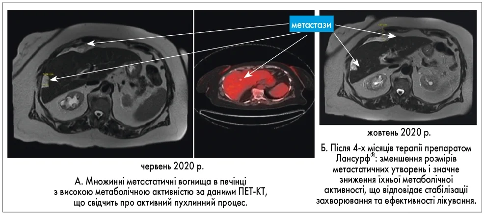 Рис. 1. Динаміка метастатичного ураження печінки за даними ПЕТ до та під час лікування препаратом Лансурф®